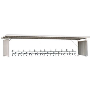 Fietsenstalling met plat dak, Totale lengte: 10.61 m, Totale diepte: 2.53 m, Model: Enkelzijdig, Aantal plaatsen: 24, Totale hoogte: 2.22 m, Kleur: Grijs, Gewicht: 500 kg, Frame materiaal: Aluminium, Wand materiaal: Staal, Dak materiaal: Aluminium, Type: Met dakpaneel en zijwanden