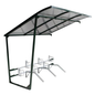Fietsenstalling met halfdoorzichtig dak van polycarbonaat. Grote aflopende beschermstrook aan de voorzijde. Solide dubbelwandig dakpaneel (10 mm). Wordt geleverd zonder zijwanden. Ruimtebesparend fietsenrek met tussengevoegde armen. Geen zelfstandige module, vereist een basismodule. Bevestiging van stalling met pluggen van het type Spit, bevestiging van fietsenrek met bouten. Zijwanden en achterwand moeten apart besteld worden.
