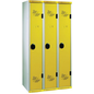 Garderobekast 3 kolommen Seamline Optimum®, Type garderobekast: Met vakken en garderobe, Materiaal: Staal, Aantal kastkolommen: 3, Onderstel: Op sokkel, Breedte kolom: 300 mm, Type sluiting: Met hangslot, Hoogte: 1800 mm, Breedte: 900 mm, Diepte: 500 mm, Plaatstaal dikte: 6/10de, Coating: Epoxy, Kleur ombouw: Lichtgrijs, Kleur deur: Geel, RAL: 7035 1018, Geleverd gemonteerd: ja, Garderobekast gebruiksomgeving: Lichte industrie, Recyclebare verpakking: Ja - 100%, Gerecyclede verpakkingen: 40 %, Recyclebaar product: Ja - 100%, Gerecycled product: 36 %, Eco-verantwoordelijke aanpak: ja, Gewicht: 59.5 kg, Aantal vakken: 2, Type: Uit één stuk, Breedte opening: 230 mm, NF Milieu: nee, NF: nee, NF Techniek: nee