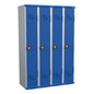 Garderobekast 4 kolommen Seamline Optimum®, Type garderobekast: Met vakken en garderobe, Materiaal: Staal, Aantal kastkolommen: 4, Onderstel: Op sokkel, Breedte kolom: 300 mm, Type sluiting: Met hangslot, Hoogte: 1800 mm, Breedte: 1200 mm, Diepte: 500 mm, Plaatstaal dikte: 6/10de, Coating: Epoxy, Kleur ombouw: Lichtgrijs, Kleur deur: Blauw, RAL: 7035 5017, Geleverd gemonteerd: ja, Garderobekast gebruiksomgeving: Lichte industrie, Recyclebare verpakking: Ja - 100%, Gerecyclede verpakkingen: 38 %, Recyclebaar product: Ja - 100%, Gerecycled product: 34 %, Eco-verantwoordelijke aanpak: ja, Gewicht: 78 kg, Aantal vakken: 2, Type: Uit één stuk, Breedte opening: 230 mm, NF: nee, NF Techniek: nee