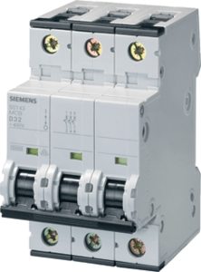 Siemens 5SY4 installatieautomaat, inbouwdiepte 70mm, uitschakelkarakteristiek D, 3 polen (totaal), 3 beveiligde polen, nom. (meet)stroom 25A, nom. (meet)spanning 400V, spanningstype AC, nom. isolatiespanning Ui 440V, nom. stoothoudspanning (Uimp) 4kV, nom. afschakelvermogen IEC 60947-2 20kA,