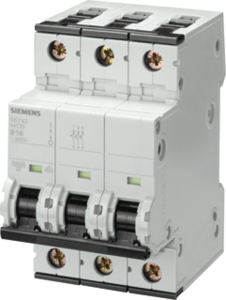 Siemens 5SY6 installatieautomaat, inbouwdiepte 70mm, uitschakelkarakteristiek C, 3 polen (totaal), 3 beveiligde polen, nom. (meet)stroom 6A, nom. (meet)spanning 400V, spanningstype AC, nom. isolatiespanning Ui 440V, nom. stoothoudspanning (Uimp) 4kV, nom. afschakelvermogen IEC 60947-2 30kA,