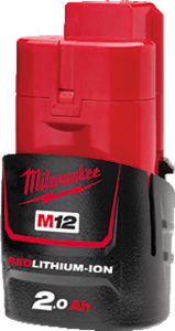 Milwaukee M12 accupack elektrisch gereedschap, uitvoering li-Ion, capaciteit 2Ah, nom. spanning 12V, te gebr bij -20°C/+75°C.