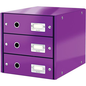 Ladekast (3 laden) Leitz Click & Store WOW, Rugbreedte: 25 cm, Materiaal: Polypropyleen, Kleur: Paars, Totale lengte: 286 mm, Totale hoogte: 358 mm, Brandveiligheid: M1, Totale breedte: 282 mm, Materiaal: Hard karton PP, VOC-vrij: ja, Totale diepte: 251 mm, Gerecyclede verpakkingen: 100 %, Voor formaat: 210 x 297 mm (A4), Model: Click&Store, Verpakking: 1 stuk