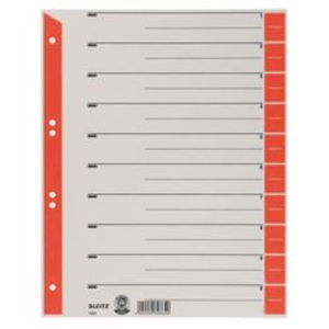 Leitz tabbladen. Van karton met bedrukte lijnen voor labels, gekleurde tabs en gekleurd perforatieframe. Extra breed zodat de tabs zichtbaar blijven, zelfs in combinatie met geperforeerde hoezen. Formaat: A4 extra breed. Afmetingen: 300 x 240 mm (H x B). Papiergewicht: 230 g/m². Kleur: Rood: 100 stuks.