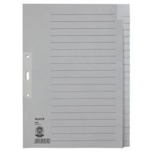 Leitz tabbladen. Met versterkte ponsgaten en tabs. Gelinieerd op de voorpagina. Bestaat uit 20 tabbladen. Gemaakt van touwpapier. Formaat: A4. Afmetingen: 300 x 223 mm (H x B). Gewicht: 100 g/m². Kleur: Grijs.