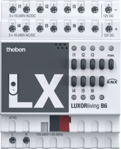 Theben LUXORliving binaire ingang bussysteem, DRA (DIN-rail adapter), 6 ingangen, beschermingsgraad (IP) IP20, met LED indicatie, bussysteem KNX, andere bussystemen LUXORliving, busaansluiting incl., breedte in module-eenheden 4, externe signaalspanning noodzakelij, ingangsspanning 8 - 250V,