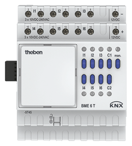 Theben binaire ingang bussysteem, DRA (DIN-rail adapter), 6 ingangen, beschermingsgraad (IP) IP20, met LED indicatie, bussysteem KNX, breedte in module-eenheden 4, externe signaalspanning noodzakelij, ingangsspanning 8 - 250V, busmodule afneembaar, type ingangsspanning AC/DC