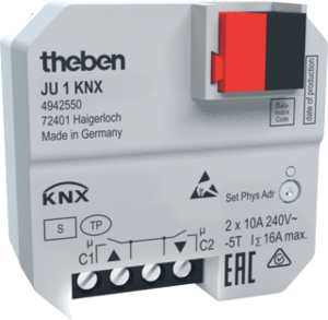 Theben jaloezie-actor bussysteem, inbouw (stucwerk), andere bussystemen overig, bussysteem KNX, beschermingsgraad (IP) IP20, max. aantal jaloezie-uitgangen 1, breedte in module-eenheden 1, 1 ingang, met schakelfunctie, schakelstroom ohms 10A, min. diepte van de inbouwdoos 35mm,