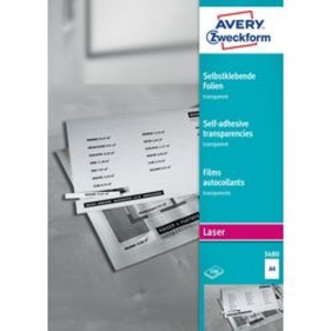 Avery Zweckform Zelfklevende folie. Transparant en zelfklevend. Geschikt voor zwart/witte laserprinters en kopieerapparaten. Dikte: 0.14 mm. Formaat: A4. Kleur: transparant. Vel per pak: 100 stuks.