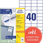 Avery multifunctionele etiketten QuickPeel. Zelfklevend: Ja. Afwerking: Glanzend. Inclusief: 4000 x multifunctionele etiketten. Labels per vel: 40. Materiaal: Papier. Afmetingen: 29,7 x 52,5 mm (h x b). Kleur: wit. Inhoud: 4000 stuks.
