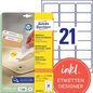 Avery Zweckform Herkleefbare etiketten L6023-25. Zelfklevend: ja. Afwerking: mat. Labels per vel: 21. Materiaal: papier. Herplaatsbaar: ja. Afmetingen: 38.1 x 63.5 mm (HxB). Kleur: wit. Aantal: 630 stuks.