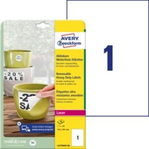Avery Herkleefbare Polyester Etiketten. Weerbestendig. Zelfklevend. Afmeting 210 x 297 mm. Pak 20 vellen, 20 etiketten. Kleur: wit.