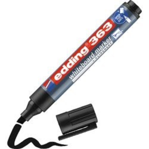 Edding Boardmarker 363. Voor de schrijven op whiteboards. Zelfs zonder dop enkele dagen houdbaar zonder uit te drogen. Droog uitwisbaar op de meeste niet-poreuze oppervlakken zoals email, glas en melamine. Uitvoering: Schuine punt. Schrijfbreedte: 2 - 5 mm. Kleur: Zwart.