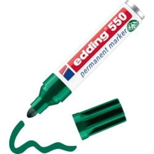 Edding Permanente marker 550. Geurarme, sneldrogende inkt, lichtbestendig, vlekbestendig en waterdicht. Verwisselbare plastic schrijfpunt. Tip en dop in schrijfkleur. Hervulbaar met opsommingsteken. Lijnbreedte: 3- 4 mm. inkt Kleur: groen.