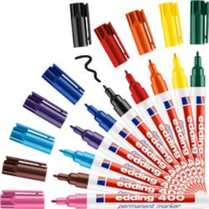 Edding permanent marker 400. Deze permanent marker is voorzien van een ronde punt en is voorzien van sneldrogende, wis- en waterbestendige inkt op alcoholbasis. Tevens is deze inkt milieuvriendelijk en schrijft op vrijwel elke ondergrond. (papier, karton, hout, glas en metaal). Punt: breed 1,0 mm. Kleur: assorti. Pak: 10 stuks.
