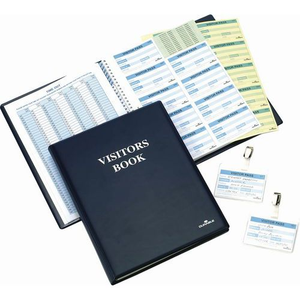 Praktisch bezoekersboek in een stijlvolle gepolsterde hoes met lederlook. Bevat 300 eenvoudig in te vullen insteekkaarten. Het geperforeerde bovenste exemplaar kan worden afgescheurd en aangebracht in de bezoekersbadge, terwijl het duplicaat wordt bewaard voor de permanente bezoekersregistratie. Het veiligheidsblad biedt bezoekers volledige vertrouwelijkheid en helpt bij het naleven van de AVG. Het uitklokblad maakt het eenvoudig om het vertrek van bezoekers bij te houden. Navulvellen beschikbaar.