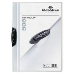 Durable klemmappen swingclip. Deze trendy klemmappen met draaibare elipsvormige klem zijn vervaardigd uit milieuvriendelijk polypropyleen. De map is eenvoudig te gebruik de klem naar buiten draaien, documenten erin leggen en terugdraaien en klaar. De opbergcapaciteit is 3 mm. Formaat: A4. Afmetingen (B x H): 22,5 x 31,0 cm. Kleur: zwart. Pak: 25 stuks.