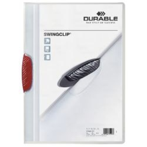 Durable klemmappen swingclip. Deze trendy klemmappen met draaibare elipsvormige klem zijn vervaardigd uit milieuvriendelijk polypropyleen. De map is eenvoudig te gebruik de klem naar buiten draaien, documenten erin leggen en terugdraaien en klaar. De opbergcapaciteit is 3 mm. Formaat: A4. Afmetingen (B x H): 22,5 x 31,0 cm. Kleur: rood. Pak: 25 stuks.