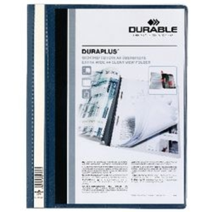 Duurzame snelhechters Duraplus 2579. Met een transparant voorvak en labelstrook over de gehele hoogte. Achterklep heeft ook een binnenvak. Breed losbladig bindmiddel geschikt voor plastic zakken. Losbladig bindmiddelmechanisme en hangrailgleuf. Gemaakt van duurzaam kunststof. Formaat: A4+. Afmetingen (B x H): 240 x 311 mm. Kleur: donkerblauw.