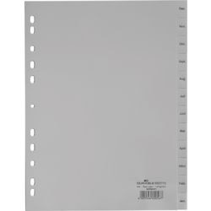 DURABLE Tabbladen 6507. Inclusief: 1 x tabbladen. Aantal geperforeerde gaten: 11 Gaten. Aantal tabbladen: 12 tabs. Basis productkleur: Grijs. Beschrijfbaar: Nee. Breedte: 230 mm. Design tabbladen: Bedrukte tab. Diepte: 1.44 mm. Etiketruimte: Nee. Formaat: A4. Gewicht: 90 g. Hoogte: 298 mm. Inclusief: 1 x tabbladen. Kleur: Grijs. Kleur tabbladen: Grijs. Materiaal: PP (Polypropeen). Materiaalsterkte: 120 micron. Merk: DURABLE. Model: 6507. Perforatie: Geperforeerd. Producttype: Tabbladen. Type tabbladen: Dec - Jan. VE: Set. Voor Formaat: A4.