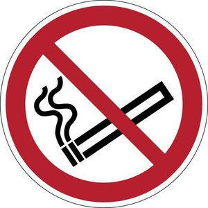 Zelfklevend pictogram voor vloermarkering, Materiaal: PVC, Lengte: 430 mm, Breedte: 430 mm, Kleur: Rood, Paneel vorm: Rond, Ø: 430 mm, Type bord: Gevaar, Zelfklevend: ja, Stijf: nee, Special Covid-19: nee, Recyclebare verpakking: Ja - 100%, Opdruk: Rookverbod