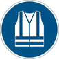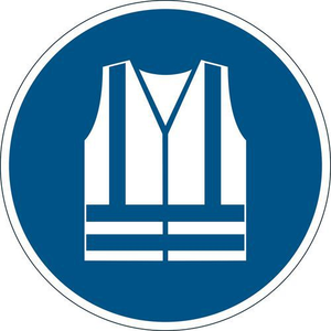 Zelfklevend pictogram voor vloermarkering met symbool, Zelfklevend: ja, Stijf: nee, Norm ISO 7010: ja, Paneel vorm: Rond, Type bord: Verplichting, Opdruk: Veiligheidsvest verplicht, Lengte: 435 mm, Breedte: 435 mm, Materiaal: PVC, Ø: 430 mm, Special Covid-19: nee, Recyclebare verpakking: Ja - 100%