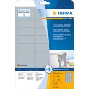Zilverkleurige oppervlakken van glanzende polyesterfolie, op A4-vellen, zelfklevend. Ideaal voor het duurzaam labelen van onderdelen, als typeplaatjes en voor de inventarisering. Hoogwaardige rvs-look. Weerbestendig, verouderingsbestendig, olie en vuil afstotend, afwasbaar, temperatuurbestendig van -40°C tot ? °C. Extreem sterk hechtend, ook op ruwe of kritische oppervlakken. Storingvrije verwerking dankzij veiligheidsrand rondom en optimale vlakligging. Voor laserprinters en kopieermachines. Niet geschikt voor inkjetprinters, kleurenlaserprinters en kleurenkopieerapparaten. Gratis softwareoplossingen: www.herma.com/software.