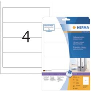 HERMA ordneretiketten 4826. Formaat: A4. Afwerking: mat. Materiaal: papier. Vellen per pak: 25. Afmetingen: 192 x 61 mm. Kleur: wit. Hoeveelheid: 100.
