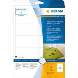 Transparante glasheldere folie-etiketten op A4-vellen, zelfklevend. Hoogglanzend, perfect voor optisch hoogwaardige toepassingen. Ideaal op glas en glanzende oppervlakken, plastic, metaal en een gekleurde ondergrond. Als hoogwaardig productetiket, voor representatieve documenten en cadeaudoosjes, voor het labelen van kantoorbenodigdheden, als etalagestickers en als deurplaatje, of voor het adresseren. No-label-effect: opschrift lijkt direct opgedrukt. Weervast, verouderingsbestendig, olie en vuil afstotend, afwasbaar. Storingvrije verwerking dankzij veiligheidsrand rondom en optimale vlakligging. Voor laserprinters en kopieerapparaten, kleurenlaserprinters en kleurenkopieerapparaten. Niet geschikt voor inkjetprinters. Gratis softwareoplossingen: www.herma.com/software.