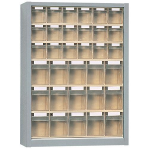Voorraadkast Stala STM, Materiaal: Staal, Totale hoogte: 910 mm, Totale breedte: 670 mm, Totale diepte: 250 mm, Max. belasting: 28 kg, Frame kleur: Grijs, Lade kleur: Transparant, Aantal bakken: 6, Aantal laden: 33, RAL: 7035, Geleverd gemonteerd: ja, Materiaal bakken: Polystyreen, Max. belasting per legbord: 40 kg, Lean Management: ja, Type: Lage kast, Materiaal kast: Staal