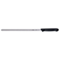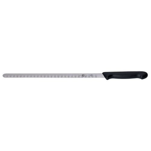 Mes voor het snijden van zalm of ham. Smal lemmet met honingraatreliëf. De uitsparingen in het lemmet vormen als het ware een luchtkussen tussen het snijvlak en het product, waardoor niks aan het lemmet plakt en zonder inspanning kan worden gesneden. Gegoten heft. Dit mes is gemaakt in Duitsland door de firma Giesser Messer, mesfabrikanten sinds 1865, en is een toonbeeld van traditie en kwaliteit. Lemmet van vacuüm-gehard staal, voor nog betere snijprestaties. Hoge kwaliteit chroom/molybdeenstaal. Met anti-slip handgreep, niet-poreus en steriliseerbaar. Het speciaal gevormde heft zorgt voor comfortabel gebruiksgemak. Wordt geleverd in kunststof houder. De aangegeven lengte is die van het lemmet.