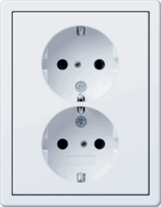 Gira F100 wandcontactdoos (wcd schakelmat.), wit, uitvoering contactdoos CEE 7/3 (type, aardcontact overig, 2 eenheden, 2 modules (bij modulair sys, aansluitwijze steekklem, met verhoogde aanraakbeveiliging, RAL-nummer 9010