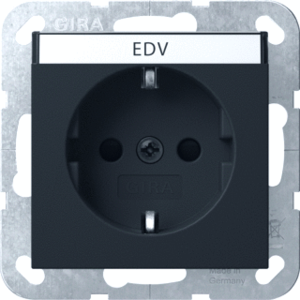 Gira Systeem 55 wandcontactdoos (wcd schakelmat.), zwart, uitvoering contactdoos CEE 7/3 (type, aardcontact overig, 1 eenheid, 1 modules (bij modulair sys, 2 fasen, aansluitwijze steekklem, met verhoogde aanraakbeveiliging, tekstveld/beschrijvingsvlak, RAL-nummer 9001