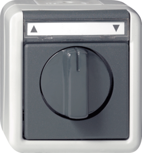 Gira Spatwaterdicht opbouw jaloezieschakelaar, kunststof, grijs, opbouw, beschermingsgraad (IP) IP44, uitvoering eenpolige schakelaar, bedieningswijze draaiknop, samenstelling basiselement met complete, kwaliteitsklasse thermoplast, 1 pool, 2 toetsen, mechanisch bedienbaar, nom. (meet)stroom 10A,