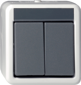 Gira Spatwaterdicht opbouw serie drukcontact, kunststof, bedieningswijze wip, samenstelling basiselement met complete, opbouw, nom. spanning 250V, 2 wippen, nom. (meet)stroom 10A, 2 contacten als maakcontact, kwaliteit thermoplast, aansluitwijze steekklem, oppervlaktebescherming overig