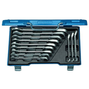 Ringzijde 13° gebogen, omschakelbaar. UD-profiel. Hoge krachtoverbrenging. In stabiele stalen cassette. Afmetingen: 320 x 210 x 55 mm. In GEDORE-blauwe plaatstalen doos.