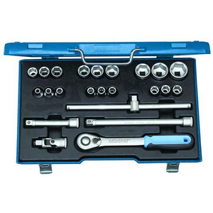 Met hulpstukken uit GEDORE-vanadium staal 31CrV3. Sortiment U-20 met robuuste omschakelbare ratel met pal, met drukknopontkoppeling. Sortiment U-3 met extra fijn vertande omschakelbare ratel. In GEDORE blauwe stalen cassette. Afmetingen: 425 x 277 x 55 mm.