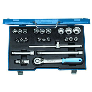 Met hulpstukken uit GEDORE-vanadium staal 31CrV3. Sortiment U-20 met robuuste omschakelbare ratel met pal, met drukknopontkoppeling. Sortiment U-3 met extra fijn vertande omschakelbare ratel. In GEDORE blauwe stalen cassette. Afmetingen: 425 x 277 x 55 mm.