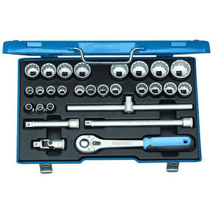 Met hulpstukken uit GEDORE-vanadium staal 31CrV3. Met robuuste omschakelbare ratel met pal, met drukknopontkoppeling. In GEDORE blauwe stalen cassette. Afmetingen: 425 x 277 x 55 mm.