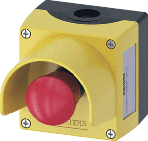 Siemens drukknopkast compleet, geschikt voor noodstop, behuizing kunststof, beschermingsgraad (IP) IP67/IP69K, 2 verbreekcontacten, 1 commandoposities, 1 paddestoel drukknoppen, bovendeel behuizing geel, beschermingsgraad (NEMA) 13, nom. stuurspanning bij AC 50 Hz 5 - 500V,