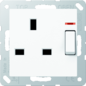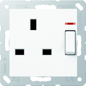 Jung wandcontactdoos (wcd schakelmat.), wit, uitvoering british Standard, 2 actieve contacten (rond), 1 eenheid, 1 contactdozen schakelbaar, 1 fasen, aansluitwijze schroefklem, met verhoogde aanraakbeveiliging, RAL-nummer 9016, met functieverlichting