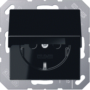 Jung wandcontactdoos (wcd schakelmat.), zwart, uitvoering contactdoos CEE 7/3 (type, 2 actieve contacten (rond), 1 eenheid, 1 fasen, aansluitwijze steekklem, met klapdeksel, RAL-nummer 9005