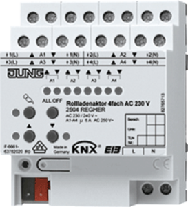 Jung EIB-KNX jaloezie-actor bussysteem, DRA (DIN-rail adapter), busaansluiting incl., bussysteem KNX, manuele bediening, beschermingsgraad (IP) IP20, max. aantal jaloezie-uitgangen 4, met LED indicatie, max. schakelvermogen 5W, breedte in module-eenheden 4, schakelstroom ohms 6A, energiebesparend,
