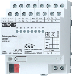 Jung binaire ingang bussysteem, DRA (DIN-rail adapter), 8 ingangen, met LED indicatie, bussysteem KNX, busaansluiting incl., breedte in module-eenheden 4, ingangsspanning 12 - 48V, type ingangsspanning AC/DC