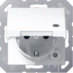 Jung wandcontactdoos (wcd schakelmat.), wit, uitvoering contactdoos CEE 7/3 (type, 2 actieve contacten (rond), 1 eenheid, 1 fasen, aansluitwijze steekklem, met klapdeksel, met verhoogde aanraakbeveiliging, RAL-nummer 9016, met functieverlichting