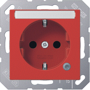 Jung wandcontactdoos (wcd schakelmat.), rood, uitvoering contactdoos CEE 7/3 (type, 2 actieve contacten (rond), 1 eenheid, 1 fasen, aansluitwijze steekklem, met verhoogde aanraakbeveiliging, tekstveld/beschrijvingsvlak, RAL-nummer 3003, met functieverlichting