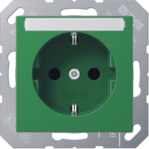 Jung wandcontactdoos (wcd schakelmat.), groen, uitvoering contactdoos CEE 7/3 (type, 2 actieve contacten (rond), 1 eenheid, 1 fasen, aansluitwijze steekklem, tekstveld/beschrijvingsvlak, RAL-nummer 6029