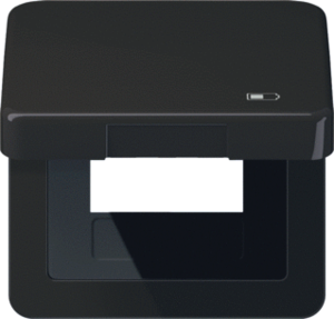 Jung afdekraam schakelmateriaal, kunststof, zwart, (bxhxd) 67x67x15mm, uitvoering oppervlakte glanzend, montagerichting horizontaal en verticaal, geschikt voor wandgoot, 1 eenheid, beschermingsgraad (IP) IP44, met klapdeksel, 1 eenheden horizontaal, RAL-nummer 9005, kwaliteit thermoplast,