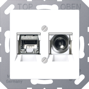 Jung inzetplaat schakelmateriaal, kunststof, wit, gebruik overig, samenstelling basiselement met centrale, inbouw (stucwerk), uitvoering oppervlakte glanzend, draagring, beschermingsgraad (IP) IP20, geschikt voor aantal connectoren 2, halogeenvrij, incl. connectoren, kwaliteit thermoplast,